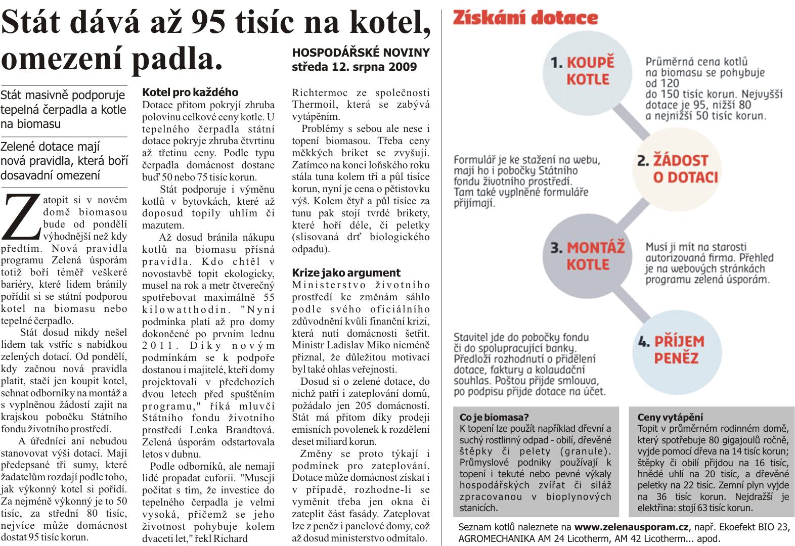 Ministerstvo životního prostředí připravilo ve spolupráci s Evropskou komisí dotační program, kde budou moci peníze z evropských fondů využít přímo občané. Dotace jsou určeny na výměnu starých neekologických kotlů za moderní nízkoemisní na biomasu, uhlí nebo jejich kombinaci, za tepelné čerpadlo nebo plynový kotel...